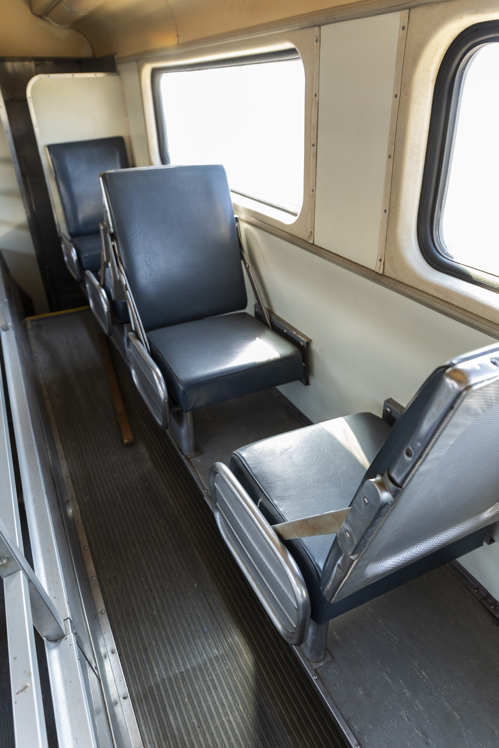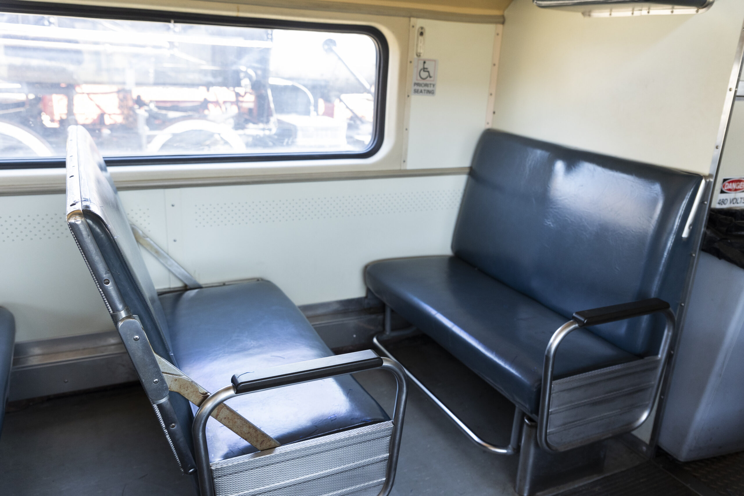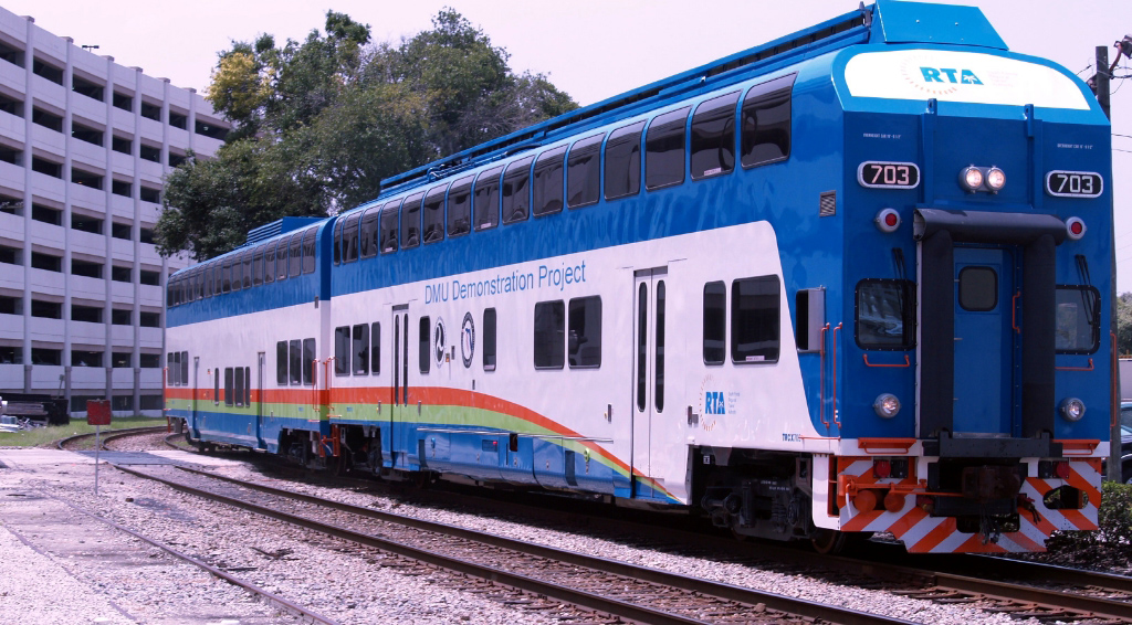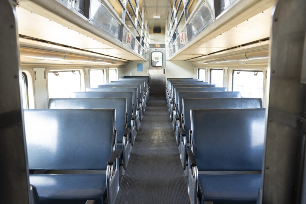 One of the newest additions to our fleet of railroad rolling stock is a fleet of six (6) modern Diesel Multiple Unit (DMU) double-deck passenger cars. Standing at 19 feet 9.5 inches tall and 89 feet long, these cars feature a design that maximizes the largest envelope possible for rail vehicles to provide the most comfortable, high-capacity commuter rail cars available on the market. Four of the six units are built with self-propulsion and cab controls while the remaining two are simply trailer cars. Originally manufactured by Colorado Railcar between 2004 – 2008, these units were built as three car train sets bound for service in Miami, FL on the Tri-Rail commuter rail system. After nearly 10 years of service in Florida from 2004 to 2014, all six cars were eventually parked on a siding until 2023, when we worked with the individuals who purchased them from Tri-Rail to arrange a lease-purchase option at IRM.