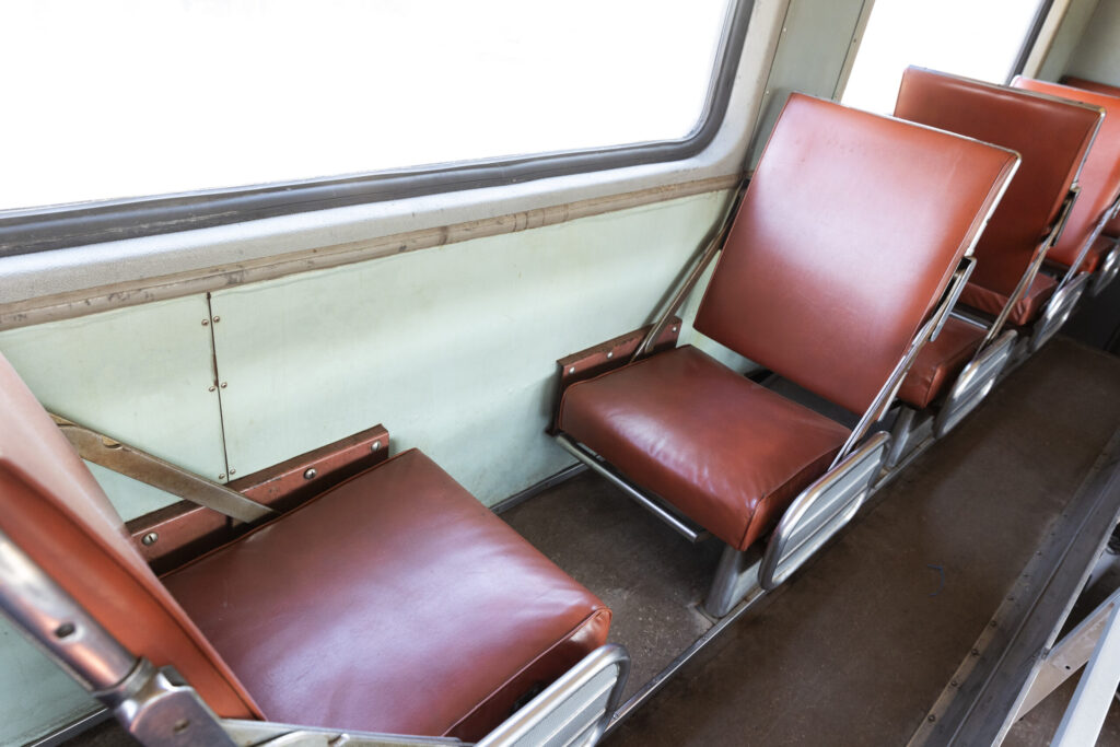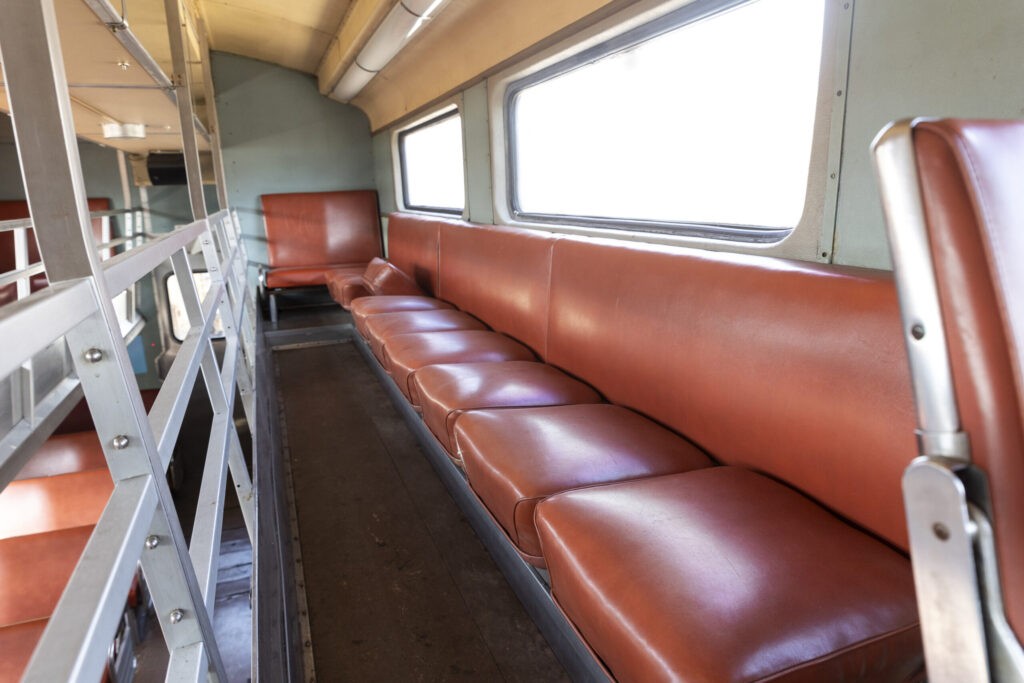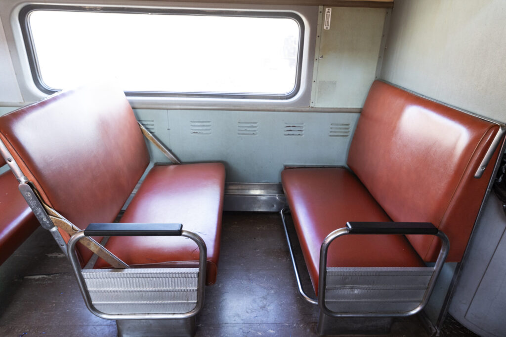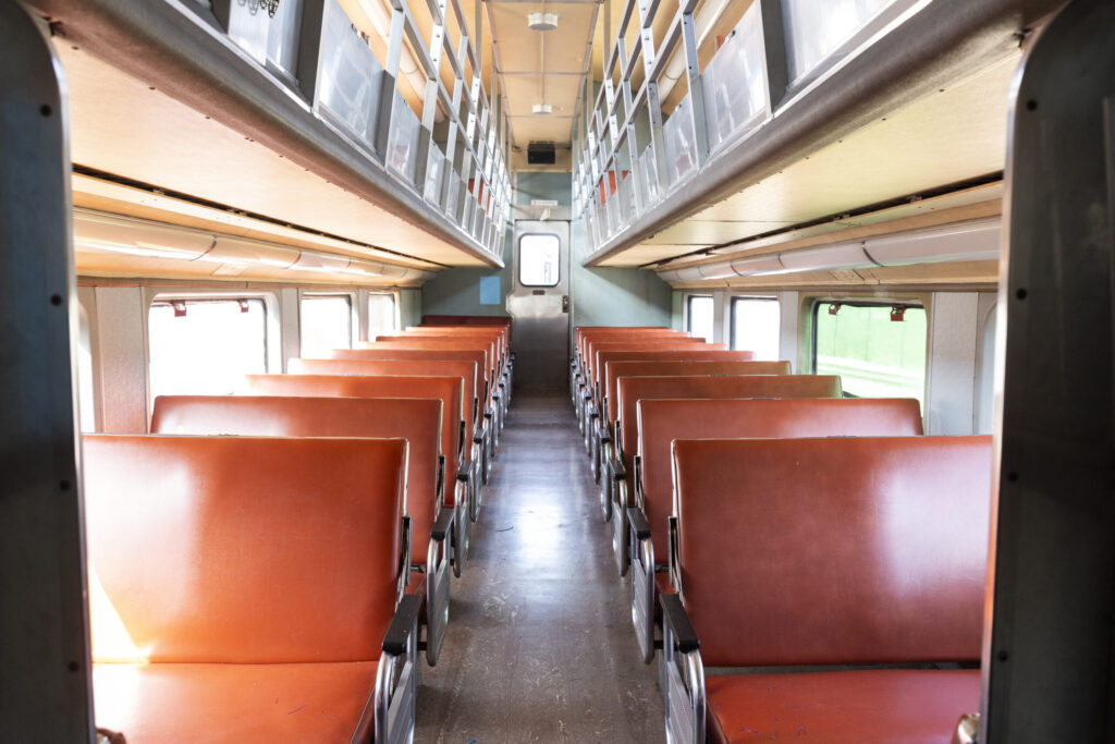These cars were originally built by the Pullman Standard Car Company for the Chicago & NorthWestern Railroad and were used in commuter service. All of the cars here were built in 1961 except for car 7850 which was built in 1968. These cars were designed specifically for the C&NW Railroad for Chicago commuter trains with a “gallery car” design, meaning that the second floor, unlike traditional double deck cars, were split into single seat sections. The split level top deck design was a cost cutting measure made by the railroad, the cars could hold more passengers than standard single level cars but didn’t require more staffing as the conductor could collect tickets from the top and bottom floors at the same time without having to climb the stairs. These cars would continue serving the Chicago metropolitan area even after the demise of C&NW and reforming into Metra. After serving with Metra for several more years they were sold to the Mid America Railcar company who then sold them to the Indiana Railway Museum in 2012.