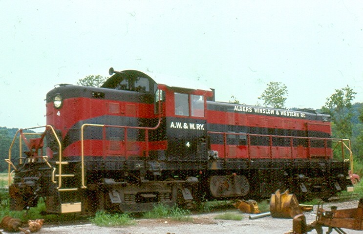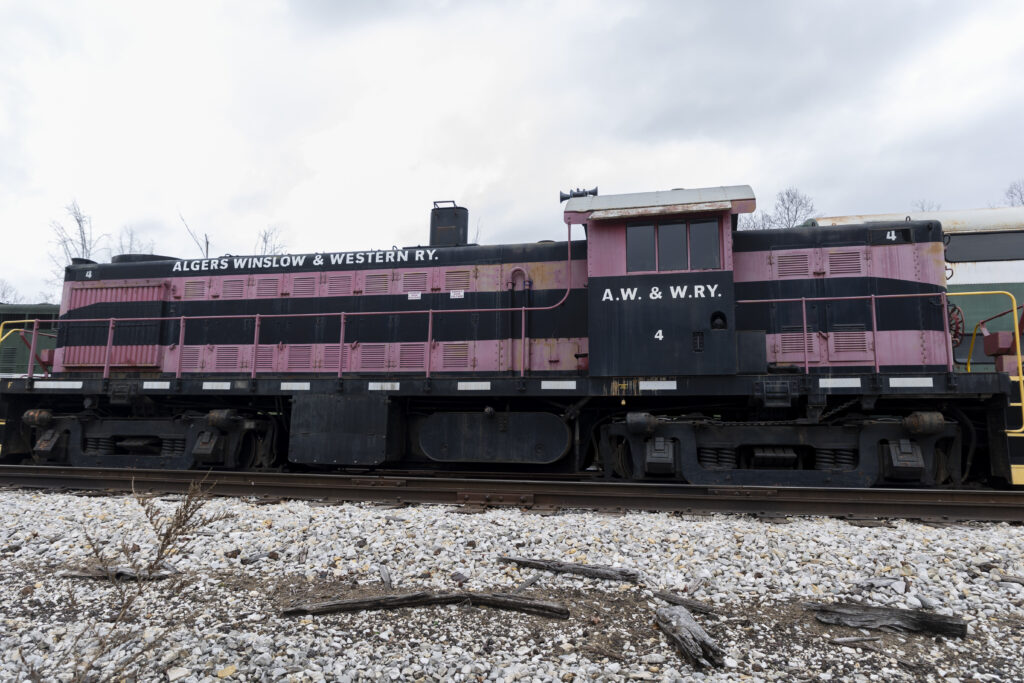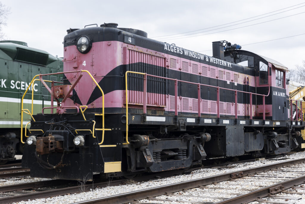 This locomotive was built by the American Locomotive Company or ALCO in January 1947 for the Duluth, South Shore and Atlantic Railway (DSS&A) with the road number of 103. The locomotive would work for the DSS&A hauling freight from the upper peninsula of Michigan along the Lake Superior shoreline of Wisconsin to Duluth. In 1961 the DSS&A would be merged into the Soo Line Railroad, the locomotive would serve on the Soo Line until it was purchased by the Algiers, Winslow and Western (AWW) in 1965. The AWW would send the locomotives purchased from the Soo Line straight to Alco where they were rebuilt before going into service. The locomotive would receive its new road number, No. 4 from the AWW and would serve the surface mining operations in Pike County, Indiana. Locomotive 4 was purchased by the Indiana Railway Museum for use on passenger trains but would occasionally continue hauling freight for the Dubois County Railroad. In 2016 the Indiana Railway Museum would repaint 4 back into the red and black paint scheme of the Algiers, Winslow and Western to show off part of its heritage.